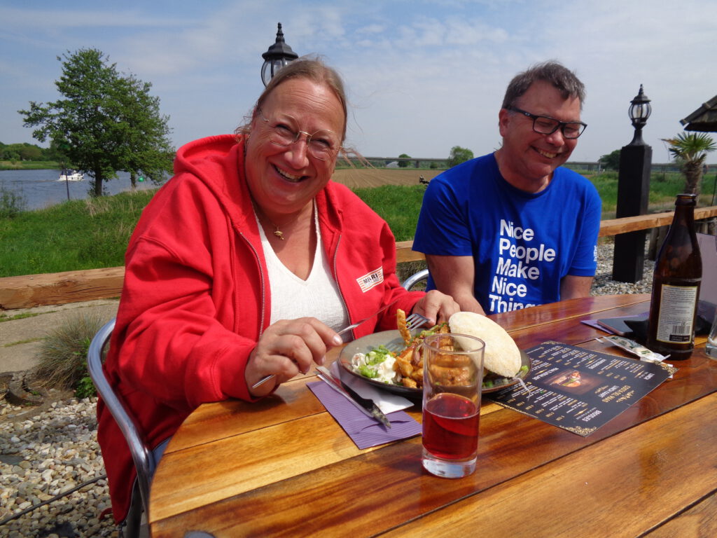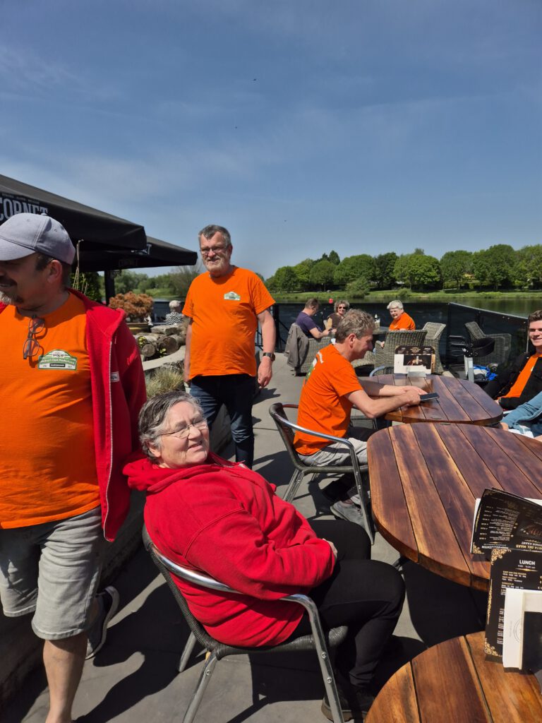 We kwamen na een korte stop bij een Tweede Wereldoorlog begraafplaats al snel in een mooi natuurgebied langs de Maas. Een prachtige oase van rust waar de koeien en dieren los rondlopen en je er zo met de auto doorheen kunt rijden. Hier zijn we ook gestopt voor de lunch. De Lunch, …. Ach ja, wat zullen we ervan zeggen?? Laten we het maar houden bij een ervaring op zich. Er zijn mensen bij die tot drie keer toe het verkeerde kregen voorgeschoteld en als we het kort samenvatten heeft eigenlijk niemand gegeten wat hij of zij besteld heeft. Bij de kroketten zat bruinbrood in plaats van witbrood, de tosti was niet warm en de kaas niet gesmolten, de kipschotel koud in plaats van warm enz. enz. enz. Ach ja, de locatie was uniek gelegen aan de Maas, het gezelschap was goed, dus al met al toch een mooie ervaring.